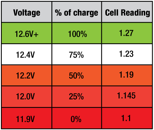 First you must fully charge the battery (see chart).  Check the battery voltage after removing any surface charge, it should read above 12.65 volts for a fully charged battery, if your battery is measuring 10.5 volts after charging it typically indicates a shorted or faulty cell.  If you can check every cell in the battery with a hydrometer, the cell readings should all be the same, a fully charged cell reads 1.265 – 1.280, if there is more than 0.05 points different it indicates a faulty battery.  Readings below 1.225 indicate the battery needs to be charged before load testing.